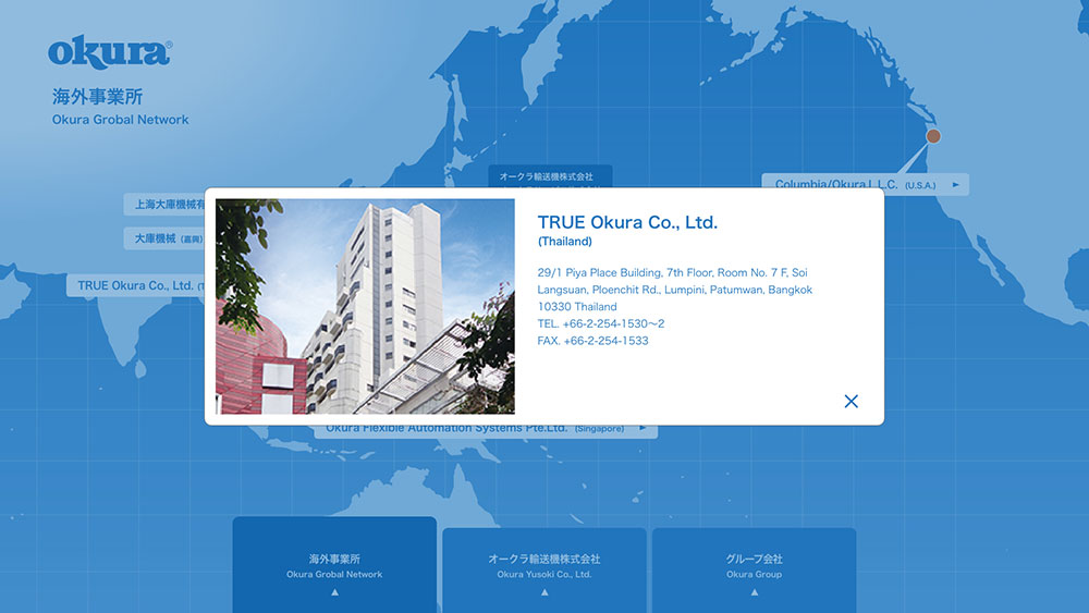 輸送機製造メーカーの敷地内にできたミュージム内に設置され、事業所とグループ会社を紹介する⼤型タッチパネルモニタを使⽤したインタラクティブなデジタルサイネージ。本社、⽀店、営業所、⼯場の位置が表⽰された⽇本地図が最初のページとなり、切り替えボタンによりサービス・メンテナンスの拠点画⾯(⽇本地図)と、海外事業所の画⾯(世界地図)が表⽰される。各拠点の⽮印ボタンで詳細画⾯が表⽰される。